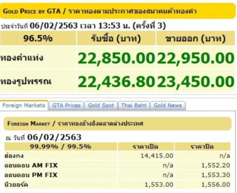 โดยสมาคมค้าทองคำรายงาน ราคาทอง ประจำวันที่ 6 ก พ 63 ครั้งที่ 3