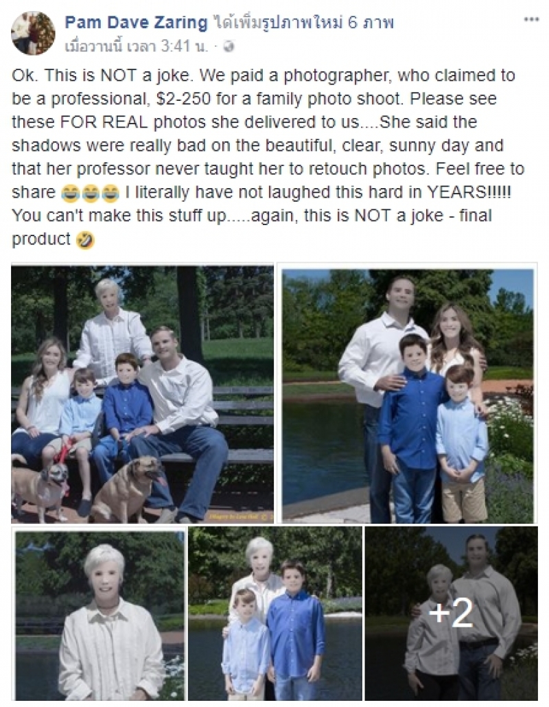 เรียกได้ว่าเป้นอีกหนึ่งภาพที่โซเชียลเข้ามาแสดงความคิดเห็นกันเยอะมากๆ หลังมีผู้ใช้เฟสบุ๊คชื่อ Pam Dave Zaring ได้โพสต์เรื่องราวโดยได้ระบุข้อความว่า โอเคทุกคน ต้องบอกตรงนี้เลยว่ามันไม่ใช่เรื่องล้อเล่น คือเราจ้างช่างภาพคนหนึ่งมาถ่ายภาพครอบครัว ในราคา 250 ดอลลาร์สหรัฐ ประมาณ 8000 บาท ซึ่งช่างภาพคนนี้อ้างว่าตัวเองเป็นมือโปร เอาล่ะ เรามาดูภาพที่เธอส่งมาให้เรากัน เธออธิบายว่าถึงแม้ว่าจะถ่ายภาพในวันที่อากาศดี ท้องฟ้าสดใส แต่แสงในภาพมันออกมาแย่ และอาจารย์ก็ไม่เคยสอนการรีทัชภาพให้กับเธอ