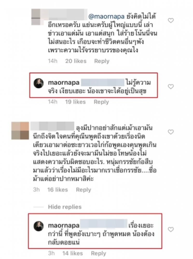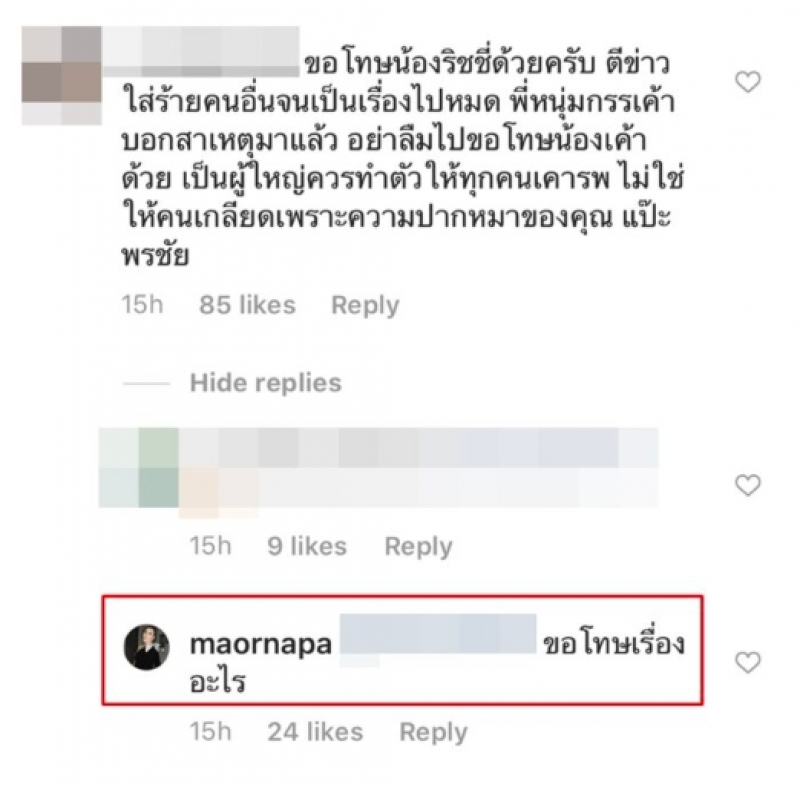โดยมีโซเชียลเข้าแสดงความคิดเห็นกันหลากหลาย และรายหนึ่งคอมเมนต์ว่า ขอโทษน้องริชชี่ด้วยครับ ตีข่าวใส่ร้ายคนอื่นจนเป็นเรื่องไปหมด พี่หนุ่มกรรเค้าบอกสาเหตุมาแล้ว อย่าลืมไปขอโทษน้องเค้าด้วย เป็นผู้ใหญ่ควรทำตัวให้ทุกคนเคารพ ไม่ใช่ให้คนเกลียด เพราะความปากหมาของคุณแป๊ะ พรชัย