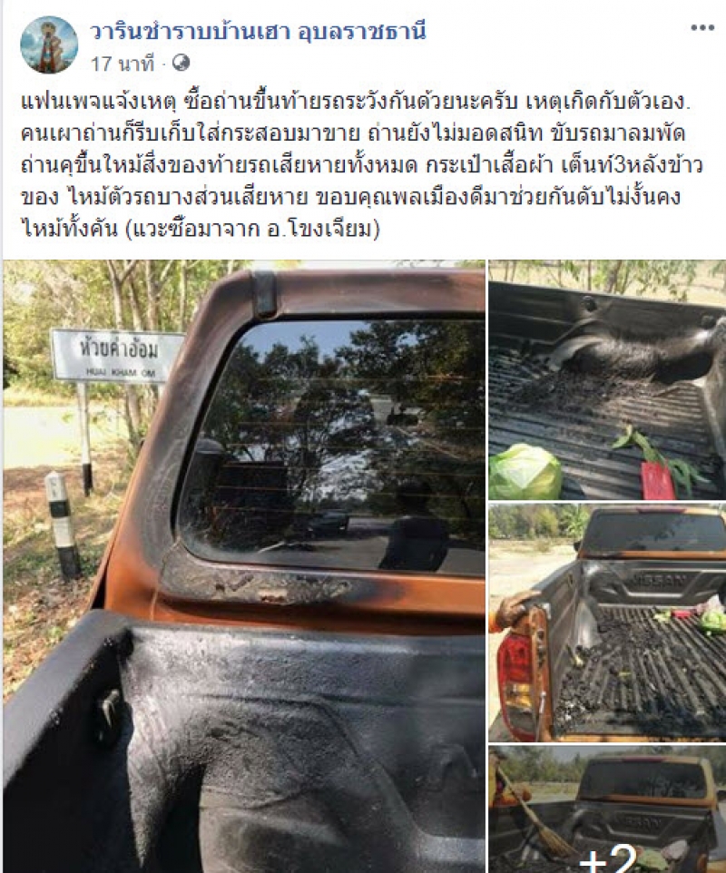 เป็นอีกหนึ่งเรื่องราวที่โซเชียลเข้ามาแสดงความคิดเห็น กันเป็นจำนวนมาก หลังมีผู้ใช้เฟสบุ๊คชื่อ วารินชำราบบ้านเฮา อุบลราชธานี ได้ออกมาโพสต์ภาพเหตุการ พร้อมทั้งระบุข้อความว่า แฟนเพจแจ้งเหตุ ซื้อถ่านขึ้นท้ายรถระวังกันด้วยนะครับ เหตุเกิดกับตัวเอง. คนเผาถ่านก็รีบเก็บใส่กระสอบมาขาย ถ่านยังไม่มอดสนิท ขับรถมาลมพัดถ่านคุขึ้นใหม้สิ่งของท้ายรถเสียหายทั้งหมด กระเป๋าเสื้อผ้า เต็นท์3หลังข้าวของ ไหม้ตัวรถบางส่วนเสียหาย ขอบคุณพลเมืองดีมาช่วยกันดับไม่งั้นคงไหม้ทั้งคัน แวะซืัอมาจาก อ โขงเจียม