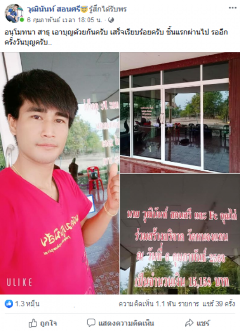 อนุโมทนา สาธุ เอาบุญด้วยกันครับ เสร็จเรียบร้อยครับ ชิ้นแรกผ่านไป รออีกครั้งวันบุญครับ ทั้งนี้มีแฟนๆ เข้าไปถามถึงเลข หนุ่ม วุฒินันท์ สอนศรี ได้ตอบคอมเม้นท์แฟนๆ อีกด้วย