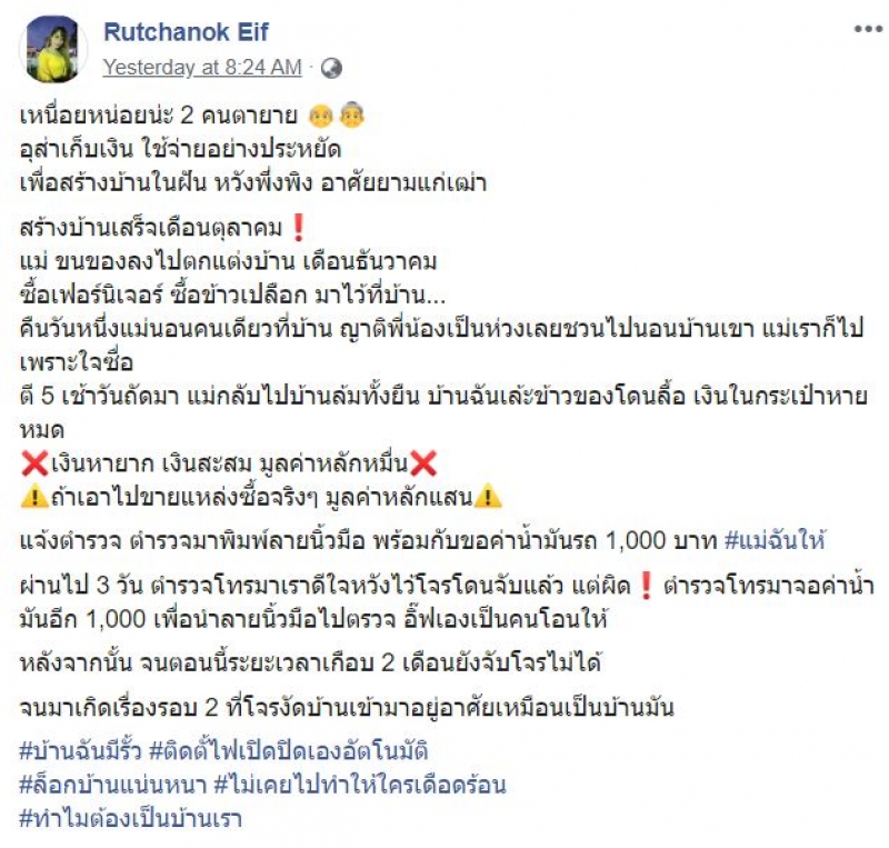 เรียกได้ว่าเป็นอีกหนึ่งเรื่องราวที่โซเชียลเข้ามาแสดงความเห็นกันเป้นจำนวนมาก หลังมีผู้ใช้เฟสบุ๊คชื่อ Rutchanok Eif ได้เผยเรื่องราวสุดช้ำ กับบ้านที่เพิ่งสร้างใหม่จอครอบครัว บ้านสร้างใหม่ โจรเข้าไปอยู่แทนแล้วจ้า ผู้พิทักษ์สันติราษฏร์อยู่ไหนระยะเวลา 1 เดือน 20 วัน โจรขึ้นบ้าน 2 ครั้ง ครอบครัวเราใช้เงินเก็บที่มีอยู่ มาสร้างบ้านในฝันของพ่อกับแม่ สร้างแบบไม่เป็นหนี้ ใช้เงินสะสมที่มี หมดไป 1300000 บาท ที่บ้านวังฮาง หนองหาน จ อุดรธานี
