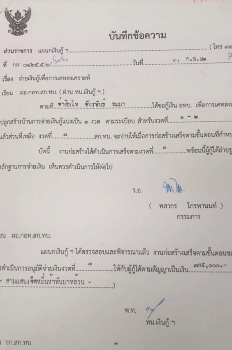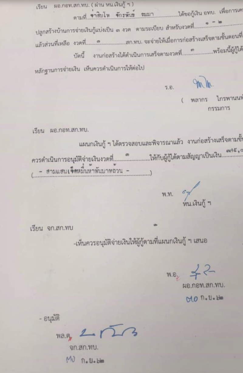 จากกรณี เกิดเหตุที่ เทอร์มินอล 21 โคราช ล่าสุด เพจ เฟสบุ๊ค ของทนายอัจฉริยะ ได้ออกมาโพสต์ เอกสารหลักฐาน ซึ่งเป็นบันทึกข้อความการจ่ายเงินเพื่อการเคหะสงเคราะห์ โดยที่ทหารคนดังกล่าวกู้เงินจาก อทบ และ อทบ ได้มีการแบ่งจ่ายออกเป็นงวด ๆ 3 รอบ และในรอบ ที่ 3 ทาง อทบ ได้จ่ายเงินเป็นจำนวน 375 000 บาท