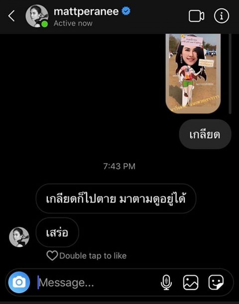 ล่าสุดต้องบอกเลยว่างานเข้าไม่หยุด หลังเพจ เจ๊มอย 108 ได้ออกมาเผยภาพแชท สนทนา หลังมีโซเชียลท่านหนึ่งไปคอมเมนท์ตอบไอจี สตอรี่ของ สาวแมท โดยแชทไปว่า เกลียดงานนี้ทำสาว แมท เดือดจนทนไม่ไหว ตอกกลับไปทันที ทั้งนี้เพจดังยังได้ระบุข้อความว่า