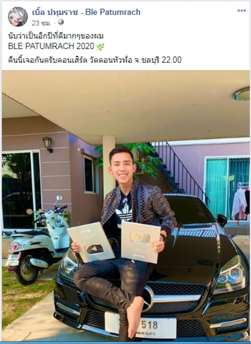 ทั้งนี้ก่อนหน้าที่จะเกิดเหตุการณ์ระทึกดังกล่าว ทางด้านหนุ่มเบิ้ลยังโพสต์ภาพคู่รถเบนซ์หรู โดยระบุว่า นับว่าเป็นอีกปีที่ดีมากๆของผม BLE PATUMRACH 2020 คืนนี้เจอกันครับคอนเสิร์ต วัดดอนหัวฬ่อ จ ชลบุรี 22 00