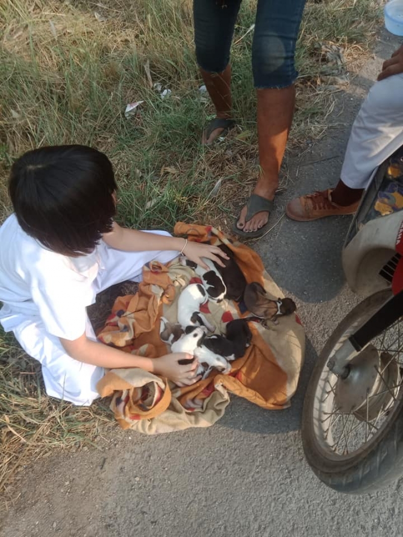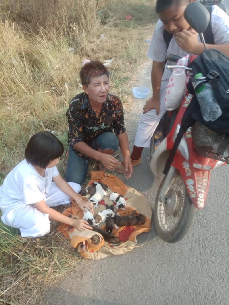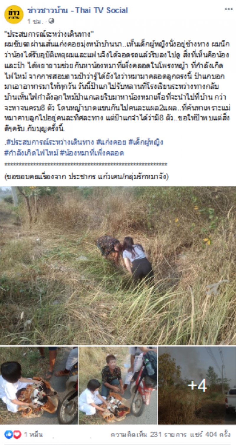 ผมขับรถผ่านเส้นแก่งคอยมุ่งหน้าบ้านนา เห็นเด็กผู้หญิงนั่งอยู่ข้างทาง ผมนึกว่าน้องได้รับ เหตุผมและแฟนจึงได้จอดรถแล้วรีบลงไปดู สิ่งที่เห็นคือน้องและป้า ได้ช่วยกันหาน้องสุนัขที่เพิ่งกำเนิดบุตรในโพรงหญ้า ที่กำลังเกิดไฟ จากการสอบถามป้า ป้าแกบอกมาเอาอาหารมาให้ทุกวัน วันนี้ป้าแกไปรับหลานที่โรงเรียนระหว่างทางกลับบ้านเห็นไฟกำลังลุกป่าแกเลยรีบมาหาน้องสุนัขเพื่อที่จะนำไปที่บ้าน กว่าจะหาจนครบ8 ตัว โดนหญ้าจนเจ็บตัวทั้งคู่