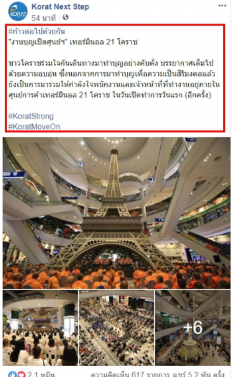วันนี้ 13 กุมพาพันธ์ 2563 ห้างเทอร์มินอล 21 ก็ได้จัดงานทำบุญครั้งยิ่งใหญ่อีกทั้งวันนี้ยังเป็นวันเปิดทำการ ห้างเทอร์มินอล 21 เป็นวันเเรก ซึ่งก็มีประชาชน ชาวโคราชเดินทางมาร่วมทำบุญคับคั่ง ซึ่งงานนี้ทางด้าน Korat Next Step นั้นก็ได้โพสต์รูปภาพพร้อมกับระบุข้อความว่าก้าวต่อไปด้วยกัน งานบุญเปิดศูนย์ฯ เทอร์มินอล 21 โคราชชาวโคราชร่วมใจกันเดินทางมาทำบุญอย่างคับคั่ง เต็มไปด้วยความอบอุ่น ซึ่งนอกจากการมาทำบุญเพื่อความเป็นสิริมงคลแล้ว ยังเป็นการมาร่วมให้กำลังใจพนักงานและเจ้าหน้าที่ที่ทำงานอยู่ภายในศูนย์การค้าเทอร์มินอล 21 โคราช ในวันเปิดทำการวันแรก อีกครั้ง