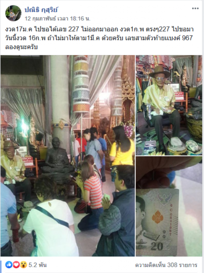โดยผู้ใช้เฟซบุ๊กชื่อ ปณิธิ กุสุริย์ ได้โพสต์ภาพไปทำบุญพร้อมระบุข้อความว่า 17 ม ค ไปขอได้เลข 227 ไม่ออกมาออก 1 ก พ ตรงๆ 227 ไปขอมาวันนี้ 16 ก พ ถ้าไม่มาให้ตาม 1 มี ค ด้วยครับ เลขสามตัวท้ายเเบงค์ 967ลองดูนะครับ