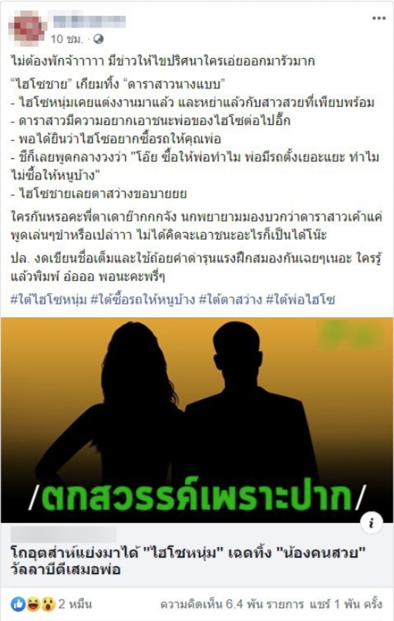 ต่อมาก็เป็นข่าวเม้าท์สนั่นเมื่อมีเพจชื่อดัง ได้ออกมาแฉว่าไฮโซหนุ่ม ที่เคยเเต่งงานมาเเล้ว เเละหย่าเเล้วกับภรรยาที่สวยเพียบพร้อม อีกทั้งเตรียมทิ้งดาราสาวคนสวย งานนี้ชาวเน็ตจำนวนมาก จึงต่างเเสดงความคิดเห็นว่า อาจจะเป็นคู่ของ ทายาทโบนันซ่า สงกรานต์ เเละ สาวแมท ภีรนีย์ หรือไม่ เเต่สุดท้ายก็กระจ่างเมื่อปรากฏว่า คู่ที่ต้องสะบั้นรักลจากกัน นั่นก็คือ สาวไพลิน โอลเซ่น เเละ ไฮโซท็อป ณัฐเศรษฐ์ นั่นเอง