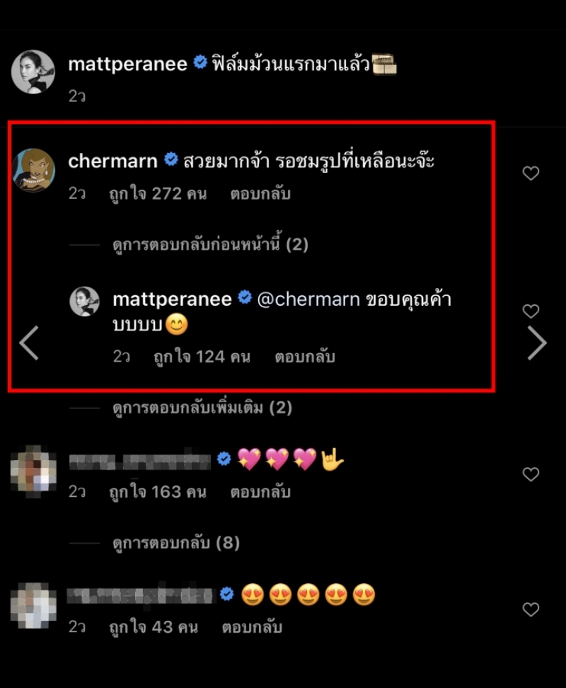 ล่าสุดนางเอกสาว มากฝีมืออย่าง พลอย เฌอมาลย์ นั้นก็โผล่คอมเมนต์กลางไอจี หลังเห็น สาวแมท ภีรนีย์ เคลื่อนไหวล่าสุด โดยการถ่ายภาพกล้องฟิล์มซึ่งงานนี้ พลอย เฌอมาลย์ นั้นก็ได้เเสดงความคิดเห็นว่า สวยมากจ้า รอชมรูปที่เหลือนะจ๊ะ อีกด้วย