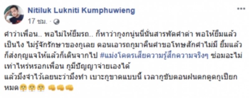 เรียกได้ว่าเป้นอีกหนึ่งเรื่องราวที่โซเชียลเข้ามาวิพากษ์วิจารณ์กันเป้นจำนวนมาก หลังมีผู้ใช้เฟสบุ๊คชื่อ Nitiluk Lukniti Kumphueieng ได้ออกมาโพสต์ข้อความระบุว่า คำว่าเพื่อน พอไม่ใ้ห้ยืมรถ ก็หาว่างกนู่นนี่นั่นสารพัดคำด่า พอให้ยืมแล้วเป็นไง ไม่รู้จักรักษาของเลย ตอนเอารถมาคืนคำขอโทษสักคำไม่มี ยิ้มแล้วก็ส่งกุญแจให้แล้วเดินจากไป เสียความรู้สึกจริงๆ ซ้อมอะไม่เท่าไหร่หรอกเพื่อน มีปัญหาจ่ายเองได้ แล้วจำไว้เลยนะว่าทำเบาะขาดขนาดนี้ เวลาขับตอนฝนตกตูดเปียกหมด
