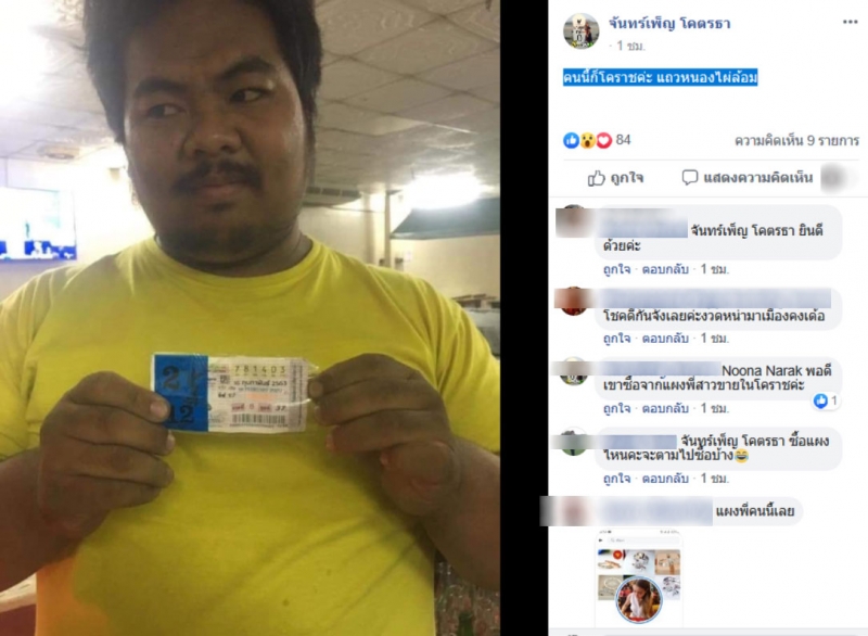 ล่าสุดทำโซเชียลเข้ามาแสดงความยินดีกันเยอะมากๆ หลังมีผู้ใช้เฟสบุ๊คชื่อ จันทร์เพ็ญ ได้ออกมาแสดงความคิดเห็น หนุ่มเมืองดคราช ถูกรางวัลที่ 1 พร้อมทั้งได้ระบุข้อความว่า คนนี้ก็โคราชค่ะ แถวหนองไผ่ล้อม