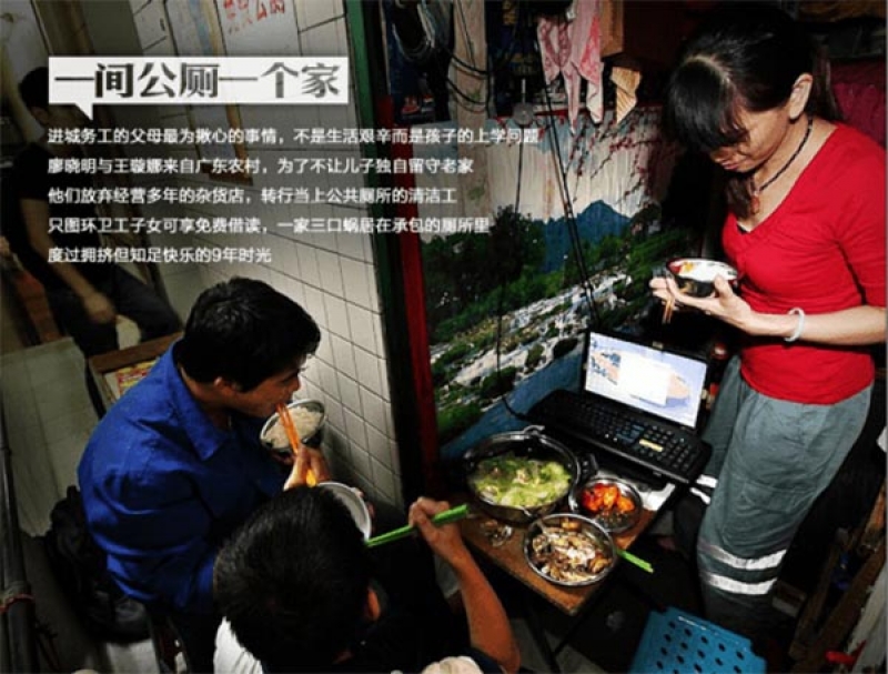 เรียกได้ว่าเป็นอีกหนึ่งเรื่องราวที่โซเชียลเข้ามาแสดงความเห็น และให้ความสนใจกันเป้นจำนวนมาก หลังเรื่องราวต่างประเทศ ได้ออกมาเผยแพร่เรื่องราว โดยมีคู่รักชื่อ Liao Xiaoming กับ Wang Xuanna ตัดสินใจทำงานหาเพื่ออนาคต และไม่อยากทิ้ง บุตรชายจึงพากันมาอยู่ที่นี้ พวกเขาเลือกงานทำความสะอาดห้องน้ำเพราะนั้นจะทำให้บุตรของเธอไม่ต้องจ่ายค่าเทอมสำหรับการศึกษาโรงเรียนในมณฑลกวางตุ้ง