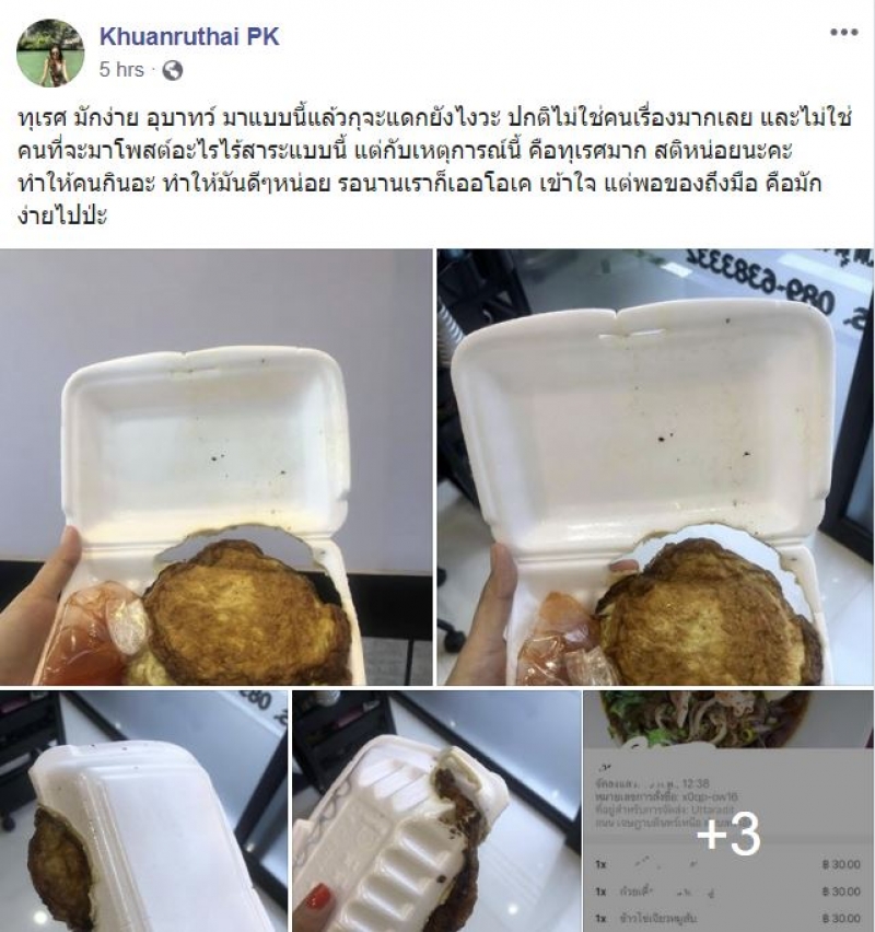 ทุเรศ มักง่ายมาแบบนี้แล้วจะกินยังไง ปกติไม่ใช่คนเรื่องมากเลย และไม่ใช่คนที่จะมาโพสต์อะไรไร้สาระแบบนี้ แต่กับเหตุการณ์นี้ คือทุเรศมาก สติหน่อยนะคะ ทำให้คนกินอะ ทำให้มันดีๆหน่อย รอนานเราก็เออโอเค เข้าใจ แต่พอของถึงมือ คือมักง่ายไปป่ะ ราคา30บาท