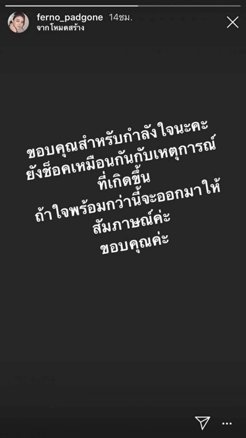 สาวใบเฟิร์นโพสต์ หลังเกิดเรื่อง ขอบคุณสำหรับกำลังใจนะคะ ยังช็อกเหมือนกันกับเหตุการณ์ที่เกิดขึ้นถ้าใจพร้อมกว่านี้จะออกมาให้สัมภาษณ์ค่ะ ขอบคุณค่ะ