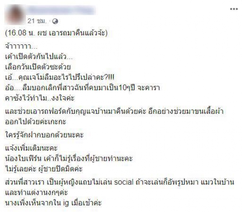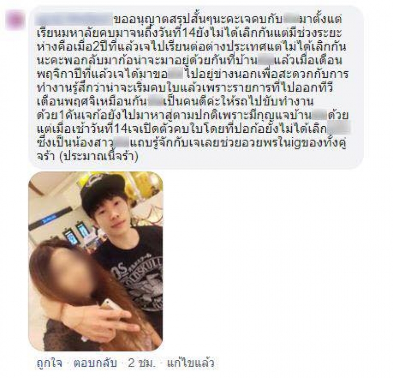 โดยหญิงสาวคนดังกล่าวโผล่คอมเม้นต์เดือดถึงพฤติกรรมคบซ้อนของฝ่ายชาย โดยอ้างว่า หนุ่มเจโม่ คบกับพี่สาวของตนมานานกว่า 10 ปีแล้ว แต่กลับปล่อยให้สถานะคาราคาซัง จึงอยากให้ช่วยเข้ามาบอก เลิก อย่างเป็นทางการ ก่อนจะฝากข้อความทิ้งท้ายว่า ให้เอารถหรูกับกุญแจบ้านกลับมาคืนด้วย