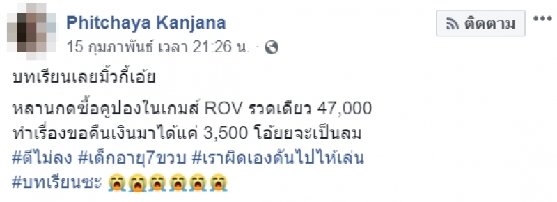 เป็นอีกหนึ่งเรื่องราวที่โซเชียลเข้ามาแสดงความเห็นกันเป็นจำนวนมาก หลังมีผู้ใช้เฟสบุ๊คชื่อ Phitchaya Kanjana ที่ได้ออกมาโพสต์เล่าเหตุการณ์ที่ทำให้เธอต้องจดจำไปอีกนาน หลังจากปล่อยให้หลานวัย 7 ขวบ เล่นโทรศัพท์มือถือเพียงลำพัง ซึ่งไม่นานหลังจากนั้นมียอดเรียกเก็บเงินมูลค่าสูงถึง 47000 บาท ส่งเข้ามาในโทรศัพท์มือถือ เนื่องจากหลานตัวแสบได้กดซื้อคูปองในเกม ROV แบบรวดเดียว