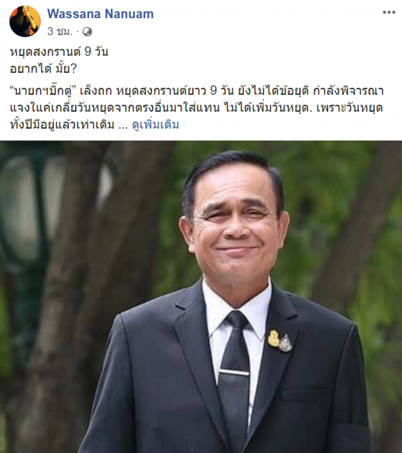 นายกฯบิ๊กตู่ เล็งถก หยุดสงกรานต์ยาว 9 วัน ยังไม่ได้ข้อยุติ กำลังพิจารณา แจงแค่เกลี่ยวันหยุดจากตรงอื่นมาใส่แทน ไม่ได้เพิ่มวันหยุด. เพราะวันหยุดทั้งปีมีอยู่แล้วเท่าเดิม พล อ ประยุทธ์ จันทร์โอชา นายกรัฐมนตรี และ รมว.กลาโหม ให้สัมภาษณ์ถึงข้อเสนอจากทีมเศรษฐกิจเพิ่มวันหยุดยาว 9 วันในช่วงเทศกาลสงกรานต์ เพื่อกระตุ้นเศรษฐกิจ ว่า ขณะนี้ยังไม่มีข้อยุติ อยู่ระหว่างการพิจาณากันอยู่ ไม่ได้เพิ่มอะไร ถ้าจะทำก็ไม่ได้เพิ่มอะไร เป็นเพียงแค่การเกลี่ยวันหยุดจากตรงอื่นมาใส่ตรงนี้แทน ไม่ได้เพิ่มวัน เพราะวันหยุดทั้งปีมีอยู่แล้วเท่าเดิม ขณะนี้เขากำลังพิจารณากันอยู่