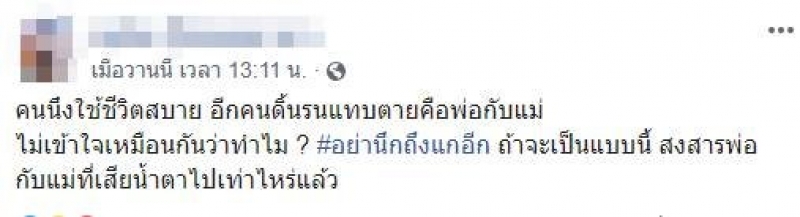 ขณะที่ เฟซบุ๊กของน้องสาวฝ่ายหญิง ได้โพสต์ข้อความว่า คนนึงใช้ชีวิตสบาย อีกคนดิ้นรนแทบตายคือพ่อกับแม่ ไม่เข้าใจเหมือนกันว่าทำไม อย่านึกถึงแกอีก ถ้าจะเป็นแบบนี้สงสารพ่อกับแม่ที่ เสียน้ำตา ไปเท่าไหร่แล้ว