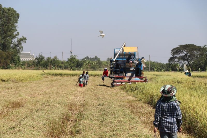 ชาวบ้านเเห่มุงรอบรถเกี่ยวข้าว