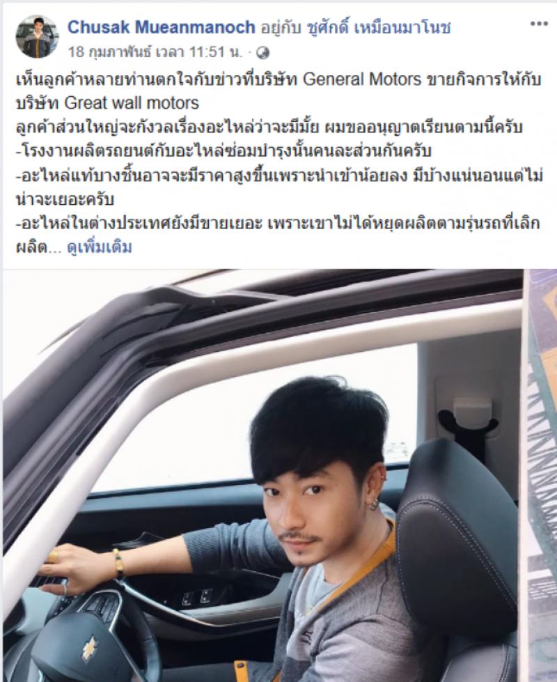 วันที่ 20 กุมภาพันธ์ 2563 ผู้สื่อข่าวรายงานว่า ผู้ใช้เฟซบุ๊กชื่อ Chusak Mueanmanoch ได้โพสต์เกี่ยวกับรถเชฟโลเรต โดยระบุข้อความว่า เห็นผู้ซื้อหลายท่านตกใจกับข่าวที่บริษัท General Motors ขายกิจการให้กับบริษัท Great wall motors