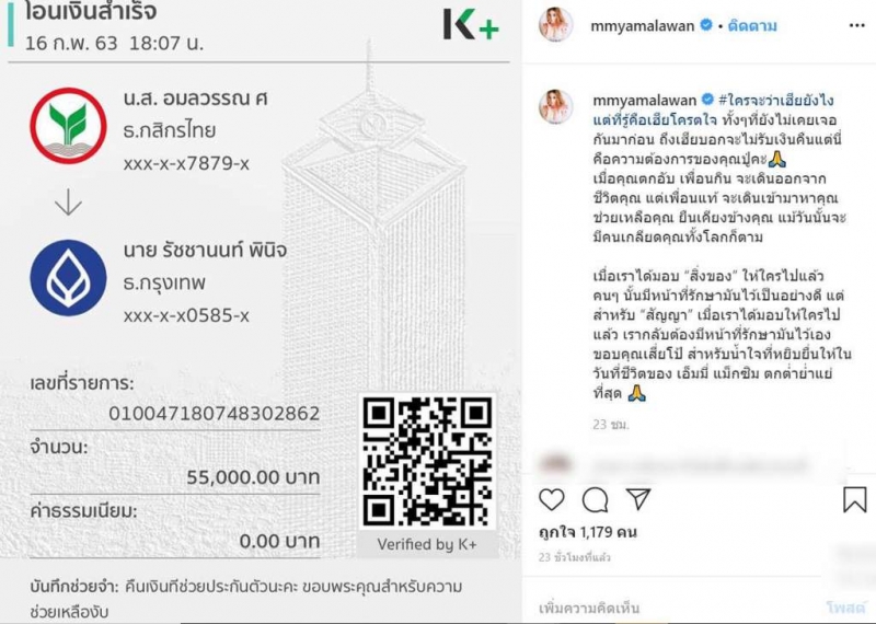 พร้อมข้อความระบุว่า ใครจะว่าเฮียยังไงแต่ที่รู้คือเฮียใจ ทั้งๆที่ยังไม่เคยเจอกันมาก่อน ถึงเฮียบอกจะไม่รับเงินคืนแต่นี่คือความต้องการของคุณปู่ค่ะ เมื่อคุณตกอับ เพื่อนกิน จะเดินออกจากชีวิตคุณ แต่เพื่อนแท้ จะเดินเข้ามาหาคุณ ช่วยเหลือคุณ ยืนเคียงข้างคุณ แม้วันนั้นจะมีคนเกลียดคุณทั้งโลกก็ตาม เมื่อเราได้มอบ สิ่งของ ให้ใครไปแล้ว คนๆ นั้นมีหน้าที่รักษามันไว้เป็นอย่างดี แต่สำหรับ สัญญา เมื่อเราได้มอบให้ใครไปแล้ว เรากลับต้องมีหน้าที่รักษามันไว้เอง ขอบคุณเสี่ยโป้ สำหรับน้ำใจที่หยิบยื่นให้ในวันที่ชีวิตของ เอมมี่ แม็กซิม ตกต่ำย่ำแย่ที่สุด
