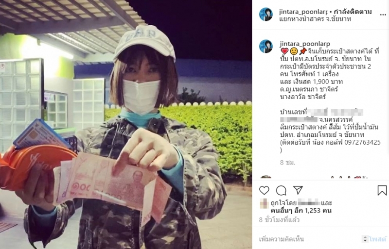 โดยงานนี้ สาวจินตรา ได้โพสต์ระบุข้อความว่า จินเก็บกระเป๋าสตางค์ได้ ที่ปั้ม ปตท อ มโนรมย์ จ ชัยนาท ในกระเป๋ามีบัตรประจำตัวประชาชน 2 คน โทรศัพท์ 1 เครื่อง และ เงินสด 1900 บาท ดญ เนตรนภา ชาจิตร์ นางลาวัล ชาจิตร์
