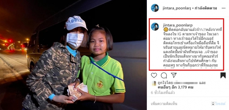 เเละหลังจากนั้น สาวจินตรา ก็ได้โพสต์อีกว่า ติดต่อกลับมาแล้วจ้าา หลังจากที่จินลงใน IG ตามหาเจ้าของ ในเวลาต่อมา ทางเจ้าของได้ใช้อีกเบอร์ ติดต่อโทรเข้าเครื่องในมือถือที่ลืม จินรับสายและนัดหมายให้มารับตรงไฟแดงถัดปั้มน้ำมันที่พบเจอ เจ้าของเป็นนักเรียนเดินทางมากับคณะทัวร์ กำลังจะเดินทางไปทัศนศึกษา กับคณะครู ทางจินก็บอกว่าพี่จินเองนะ น้องดีใจมากโผเข้ากอดจินร้องไห้ และทั้งนี้จินก็ได้มอบเงินช่วยเหลือให้น้องอีก 3000 บาท ค่ะ