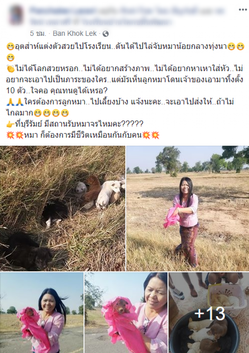 เรียกได้ว่าเป็นอีกหนึ่งภาพที่โซเชียลเข้ามาแสดงความเห็นกันเยอะมากๆ หลังมีผู้ใช้เฟสบุ๊ครายหนึ่ง ได้ออกมาโพสต์ภาพคุณครู พร้อมทั้งได้ระบุข้อความว่า อุตส่าห์แต่งตัวสวยไปโรงเรียน ดันได้ไปไล่จับสนัขน้อยกลางทุ่งนา ไม่ได้โลกสวยหรอก ไม่ได้อยากสร้างภาพไม่ได้อยากหาเหาใส่หัว ไม่อยากจะเอาไปเป็นภาระของใคร แต่มันเห็นสุนัข คุณทนดูได้เหรอ ใครต้องการไปเลี้ยงบ้าง แจ้งนะคะ จะเอาไปส่งให้ถ้าไม่ไกลมาก