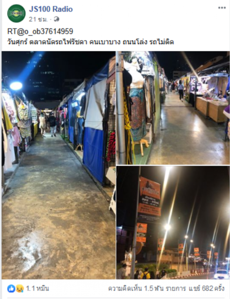 เป็นอีกหนึ่งภาพที่โซเชียลเข้ามาแสดงความเห็นกันเป็นจำนวนมาก เมื่อวันที่ 21 กุมภาพันธ์ ที่ผ่านมา เฟซบุ๊กเพจ JS100 Radio ได้มีการลงภาพตลาดนัดรถไฟที่รัชดา ซึ่งแทบทุกทางเดินต่างก็เงียบเหงา มี คนมาเดินตลาดน้อยกว่าปกติ ต้องบอกเลยว่า พ่อค้า แม่ค้านั้น เงียบเหงามากๆ หลายคนหลายเจ้าของของกิจการต่างก็โอดเรื่องเศรษฐกิจ หลายคนบอกแบบนี้จะเอาที่ไหนจ่ายค่าเช่า เอาเป้นว่าเราไปชมภาพด้านล่างกันเลยดีกว่าจ้า