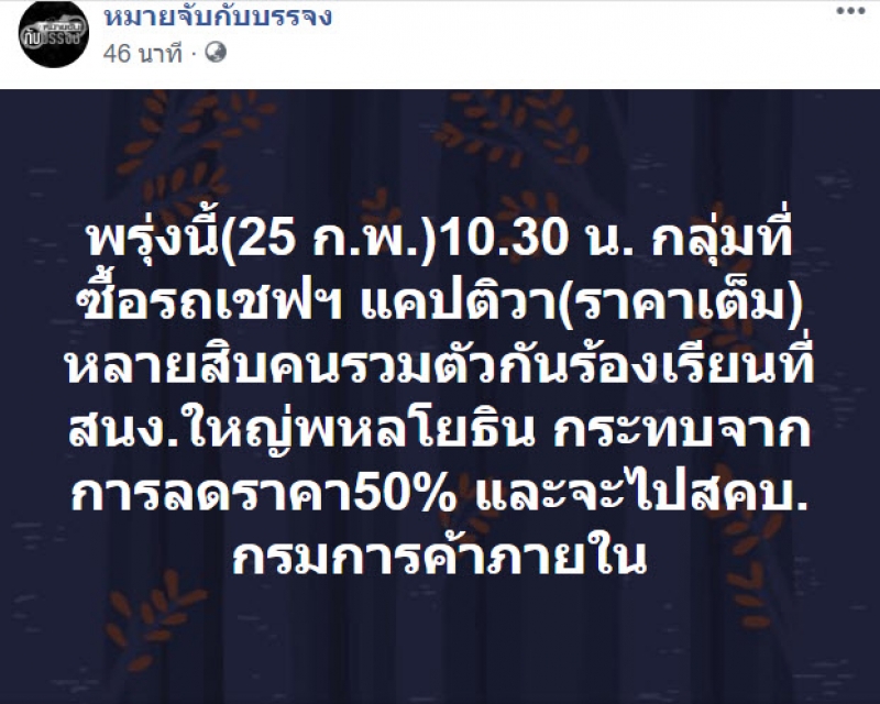 พรุ่งนี้ 25 กพ 10 30 น กลุ่มที่ซื้อรถเชฟฯ แคปติวา ราคาเต็ม หลายสิบคนรวมตัวกันร้องเรียนที่ สนง ใหญ่พหลโยธิน กระทบจากการลดราคา50% และจะไปสคบ กรมการค้าภายใน