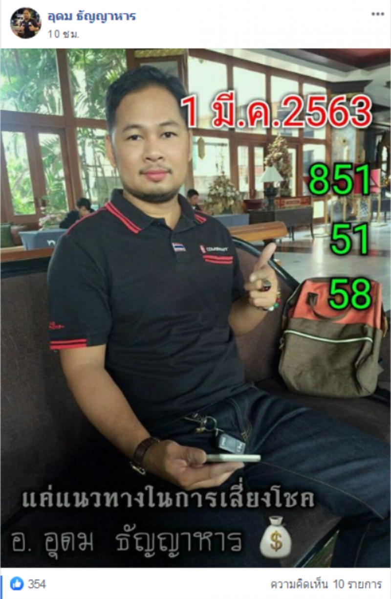 ใกล้เข้ามาทุกทีแล้วจ้า สำหรับการประกาศผลรางวัล สลากกินแบ่งรัฐบาลประจำวันที่ 1 มีนาคม 63 ต้องบอกเลยว่าเพื่อนๆหลายๆคนคงมีเลขสวยๆอยู่ในใจแล้ว และเพื่อนๆหลายๆคนคงกำลงมองหาเลขสวยๆอยู่ วันนี้เราจึงได้รวบรวมข้อมูลมาฝากกัน หลังมีผู้ใช้เฟสบุ๊คชื่อ อุดม ธัญญาหาร ได้ออกมาโพสต์ภาพพร้อมระบุเลข ทำเอาแฟนๆแห่คอมเม้นท์สนั่น