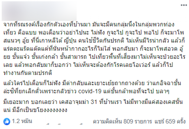 จากกรณี เพจดังในโลกออนไลน์ได้โพสต์จวกหนักถึงประชาชนที่ไม่ยอมฟังคำเตือนของสธ.และดันทุรังที่จะไปเที่ยวต่างประเทศที่เป็นประเทศสุดเสี่ยงในช่วงนี้ว่า จากที่รณรงค์เรื่องกักตัวเองที่บ้านมา มันจะมีคนกลุ่มนึงในกลุ่มพวกท่องเที่ยว คือแบบ พอเตือนว่าอย่าไปนะ ไม่ฟัง จะไป จะไป พอไป ก็จะมาโพสต์แนวๆ อู้ย ที่นี่เกาหลีใต้ ญี่ปุ่น คนใช้ชีวิตกันปกติ ไม่เห็นมีไรน่ากลัว