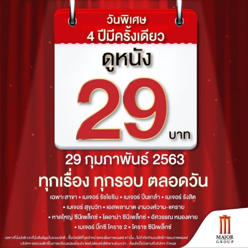 ต้องบอกเลยว่าในเดือนกุมภาพันธ์ 2563 มีทั้งหมด 29 วัน ทำให้ทางเมเจอร์ซีนีเพล็กซ์ ได้มีการจัดกิจกรรมเพิ่มความสุขกับแคมเปญ วันพิเศษ 4 ปีมีครั้งเดียว ดูหนัง 29 บาท โดยสามารถดูภาพยนตร์ได้ในวันที่ 29 กุมภาพันธ์ 2563 กับทางสาขาที่เข้าร่วมรายการ โดยมีรายละเอียดในการรับสิทธิ์ดูภาพยนตร์ดังต่อไปนี้