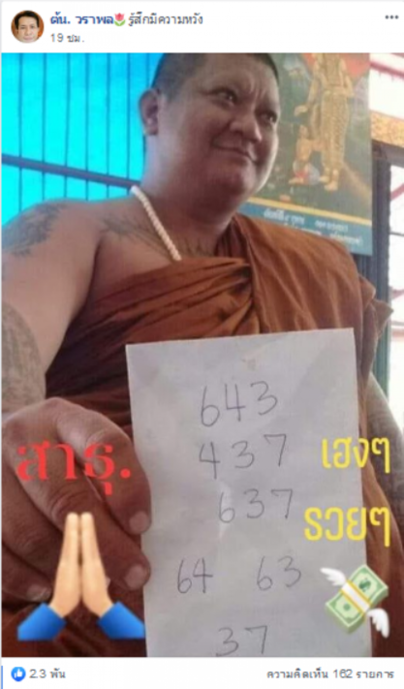 ใกล้เข้ามาทุกทีแล้วจ้า สำหรับการประกาศผลรางวัล สลากกินแบ่งรัฐบาลประจำวันที่ 1 มีนาคม 63 ต้องบอกเลยว่าเพื่อนๆหลายๆคนคงมีเลขสวยๆอยู่ในใจแล้ว และเพื่อนๆหลายๆคนคงกำลงมองหาเลขสวยๆอยู่ วันนี้เราจึงได้รวบรวมข้อมูลมาฝากกัน หลังมีผู้ใช้เฟสบุ๊คชื่อ ต้น วราพล ได้ออกมาโพสต์ภาพหลังไปทำบุญพร้อมพระให้เลข ทำเอาโซฌชียลเข้ามาแสดงความเห็นกันเยอะมากๆ