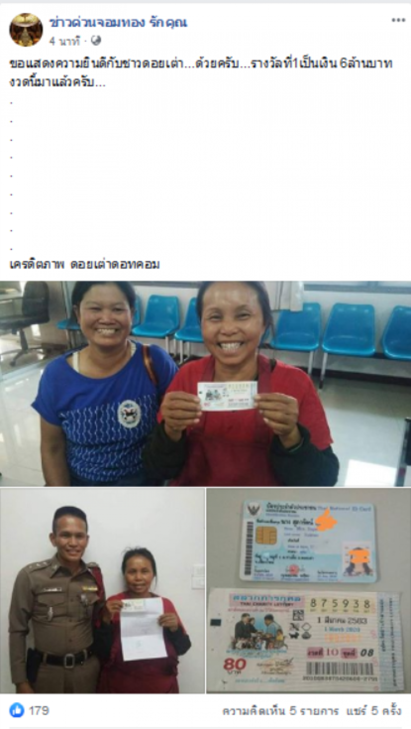 ล่าสุดมีผู้ใช้เฟสบุ๊คชื่อ ข่าวด่วนจอมทอง รักคุณ ได้ออกมาโพสต์ภาพผู้โชคดีถูกรางวัลที่ 1 พร้อมทั้งได้ระบุข้อความว่า ขอแสดงความยินดีกับชาวดอยเต่า ด้วยครับ รางวัลที่1เป็นเงิน 6ล้านบาท รอบนี้มาแล้วครับ