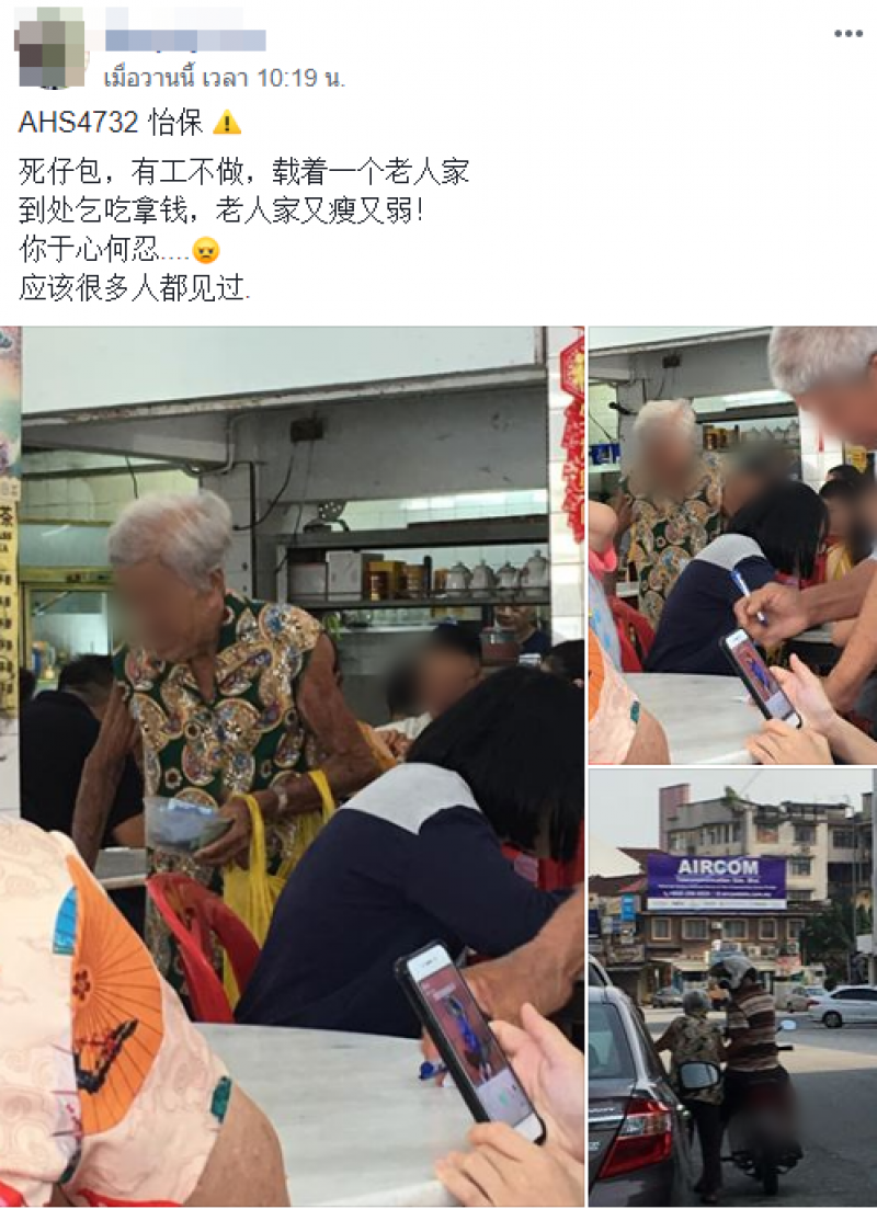 กลายเป็นเรื่องหดหู่หลังผู้ใช้เฟซบุ๊กชาวจีนท่านหนึ่งออกมาโพสต์ภาพพร้อมเล่าเรื่องราวที่ไม่ดีในสังคมความเห็นแก่ตัวของครอบครัวหนึ่งที่ให้คนแก่ไปเดินขอทานตามร้านโต๊ะร้านอาหาร พร้อมถ้วยเล็กๆในมือเดินขอเงินจากลูกค้าในร้านเพื่อประทังชีวิต ดูแล้วเป็นภาพให้ชวนสะอึกอยู่ไม่น้อย หลายคนได้ช่วยให้ทานคุณทวดผู้น่าสงสารนี้ไปคนละเล็กละน้อยจนได้มาประมาณหนึ่ง คุณยายขอบคุณลูกค้าในร้านยกใหญ่ก่อนจะเดินออกจากร้านไป
