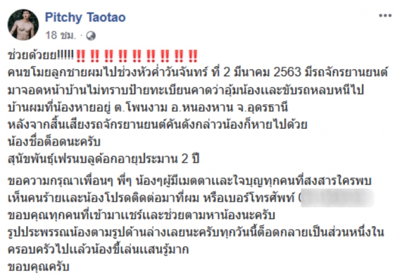 เชื่อว่างานนี้สาวๆคงอยากจะช่วยกันตามหากันทั้งโซเชี่ยลเลยที่เดียวสำหรับหนุ่มรายหนึ่งที่ประกาศตามหาสุนัขหาย แต่ชาวโซเชี่ยลกลับไม่โฟกัสที่สุนัขหายกลับโฟกัสเจ้าของหมา เมื่อวันที่ 2 มีนาคม ผู้ใช้เฟสบุ๊คชื่อว่า Pitchy Taotao ได้โพสต์ข้อความระบุว่า ช่วยด้วยย คนขโมยสุนัขผมไปช่วงหัวค่ำวันจันทร์ ที่ 2 มีนาคม 2563 มีรถ จยย มาจอดหน้าบ้านไม่ทราบป้ายทะเบียนคาดว่าอุ้มน้องเเละขับรถหลบหนีไป บ้านผมที่น้องหายอยู่ ต โพนงาม อ หนองหาน จ อุดรธานี หลังจากสิ้นเสียงรถคันดังกล่าวน้องก็หายไปด้วย