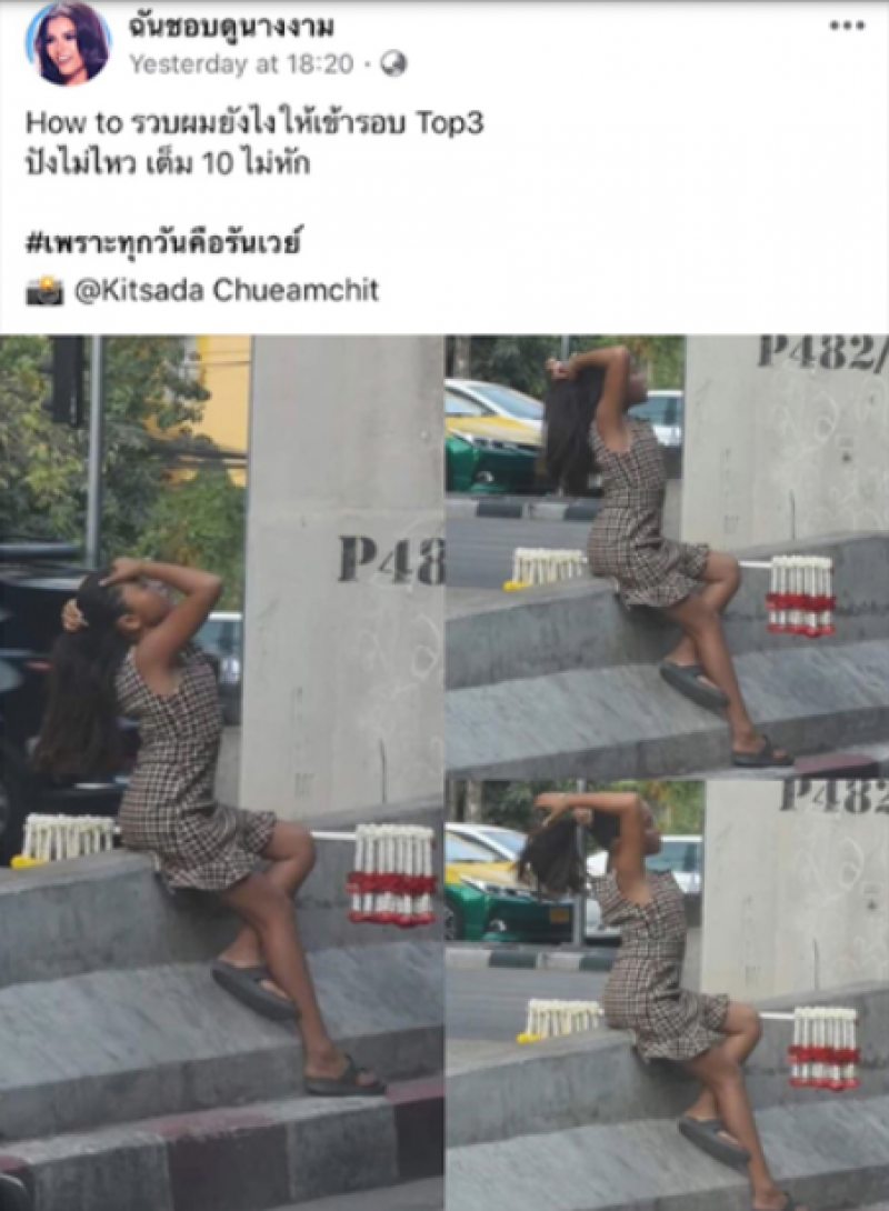 จากกรณีโลกออนไลน์ และแฟนเพจเฟซบุ๊กนางงามนำภาพถ่ายของคนที่สัญจรผ่านบริเวณทางลงด่วนพระราม 9 ตัดกับถนนเพชรอุทัย มุ่งหน้า RCA เห็นภาพหญิงสาวขายพวงมาลัยกำลังนั่งบนแบริเออร์สยายรวบผม ในอริยบทที่คนเห็นแล้วต่างเข้าไปชื่นชม และบอกว่าองค์ประกอบทุกอย่างได้ บางคนแซวว่า