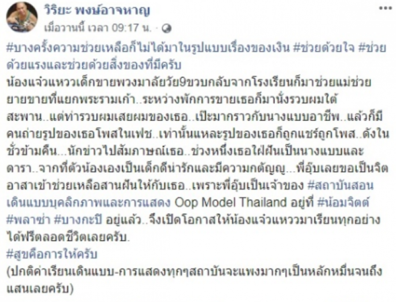 พี่อุ๊บเลยขอเป็นจิตอาสาเข้าช่วยเหลือสานฝันให้กับเธอเพราะพี่อุ๊บเป็นเจ้าของ สถาบันสอนเดินแบบบุคลิกภาพและการแสดง Oop Model Thailand อยู่ที่ น้อมจิตต์ พลาซ่า บางกะปิ อยู่แล้วจึงเปิดโอกาสให้น้องแจ๋วแหววมาเรียนทุกอย่างได้ฟรีตลอดชีวิตเลยครับ สูขคือการให้ครับ ปกติค่าเรียนเดินแบบการแสดงทุกๆสถาบันจะแพงมากๆเป็นหลักหมื่นจนถึงแสนเลยครับ