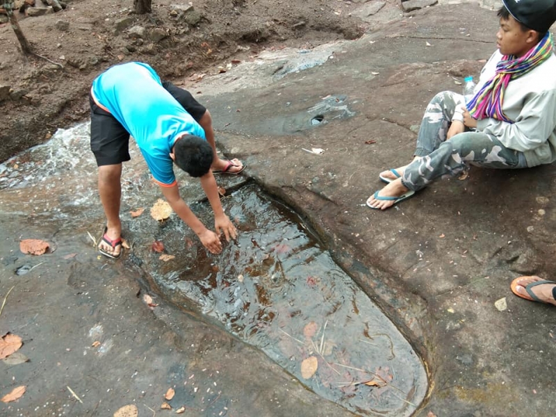 เมื่อเดินไปถึงจุดหมาย น้องๆทีมงานช่วยกันวิดน้ำฝนที่ท่วมขังและกวาดขี้โคลนออกจากรอยพระพุทธบาทจนสะอาดตา สภาพเดิมเมื่อค้นพบใหม่ จะมีทรายปิดทับรอยพระพุทธบาทไว้ เป็นหินสีธรรมชาติ และต่อมาชาวบ้านได้นำสีทองมาทาทับไว้