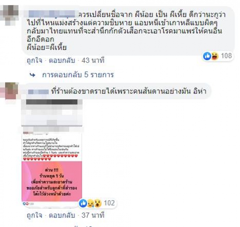 งานนี้หลายคนเข้ามาคอมเมนต์วิพากษ์วิจารณ์อย่างหนัก และระบุว่า แบบนี้กฎหมายควบคุมโรคจะมีความหมายอะไร และร้านหมูกระทะดังกล่าวก็ได้ออกมาระบุว่าจะปิดร้าน 1 วัน เพื่อทำความสะอาด เนื่องจากทางร้านไม่สามารถคัดกรองลูกค้าได้ ซึ่งสมาชิกเฟซบุ๊กมองว่าสิ่งที่ผีน้อยรายดังกล่าวทำนั้น เดือดร้อนไปถึงร้านหมูกระทะที่ต้องเสียรายได้ไป 1 วัน