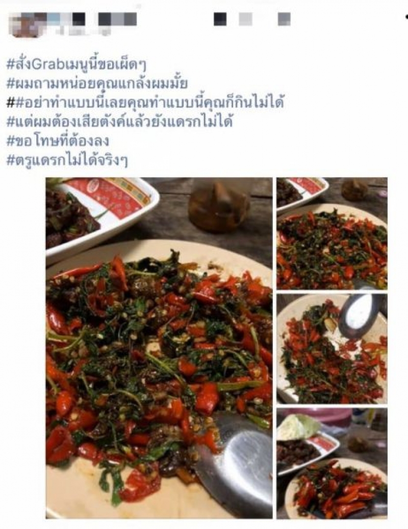 สั่งแกร็บขอเมนูเผ็ดๆ ถามจริงแกล้งผมไหม อย่าทำแบบนี้เลยทำแบบนี้คุณก็กินไม่ได้ แต่ผมต้องเสียตังค์ แล้วกินไม่ได้ ขอโทษที่ต้องลง ผมกินไม่ได้จริงๆ