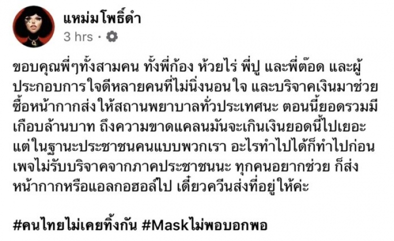 ล่าสุดด้าน เพจแหม่มโพธิ์ดำ ได้โพสต์ข้อความด้วยว่า ขอบคุณพี่ๆ ทั้งสามคน ทั้งพี่ก้อง ห้วยไร่ พี่ปู และพี่ต๊อด และผู้ประกอบการใจดีหลายคนที่ไม่นิ่งนอนใจ และบริจาคเงินมาช่วยซื้อหน้ากากส่งให้โรงบาลทั่วประเทศนะ ตอนนี้ยอดรวมมีเกือบล้านบาท