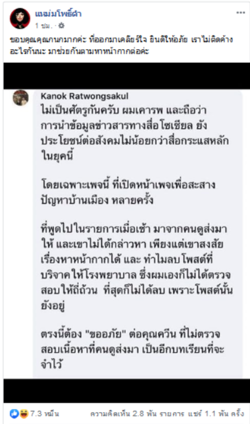 ล่าสุดเพจ แหม่มโพธิ์ดำ โพสต์ข้อความที่นายกนกขอโทษถึงเหตุการณ์ที่เกิดขึ้นว่า ไม่เป็นศัตรูกัน ผมเคารพ ถือว่าเป็นการนำข้อมูลข่าวสารทางสื่อโซเชียล ยังประโยชน์ต่อสังคมไม่น้อยกว่าสื่อกระแสหลัก โดยเฉพาะเพจนี้ที่เปิดหน้าเพจ เพื่อสะสางปัญหาบ้านเมืองหลายครั้ง
