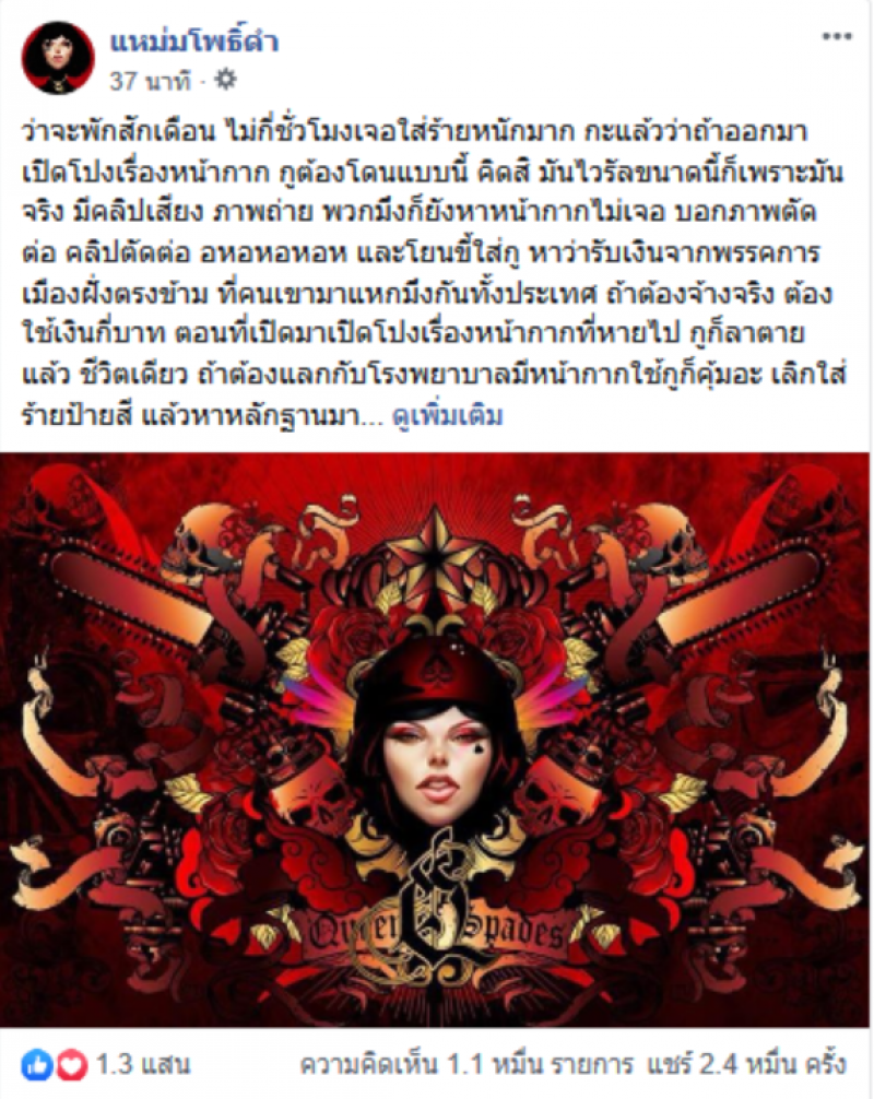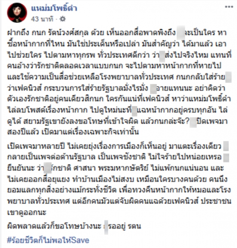 ใครกันแน่ที่เฟคนิวส์ หาว่าแหม่มโพธิ์ดำไล่ลบโพสต์เรื่องหน้ากาก ไปดูใหม่นะที่พูดเรื่องหน้ากากอยู่ครบทุกอัน ไล่ดูได้ บางเพจเขายังลงขอโทษที่เข้าใจผิด แล้วกนกล่ะจ๊ะ ปิดเพจมาสองปีแล้ว เปิดมาแต่เรื่องเฉพาะกิจเท่านั้น เปิดเพจมาหลายปี ไม่เคยยุ่งเรื่องการเมืองก็เห็นอยู่ มาแตะเรื่องเดียว กลายเป็นเพจต่อต้าน ไม่ใจร้ายไปหน่อยเหรอ คนนึงยอมแลกทุกสิ่งอย่างแม้กระทั่งชีวิต เพื่อทวงคืนหน้ากากให้หมอและโรงบาลทั่วประเทศ แต่อีกคนมัวแต่จับผิดด้วยเฟคนิวส์ ประชาชนเขาดูออกนะ ผิดพลาดแล้วก็ขอโทษบ้างนะรออยู่ รตน
