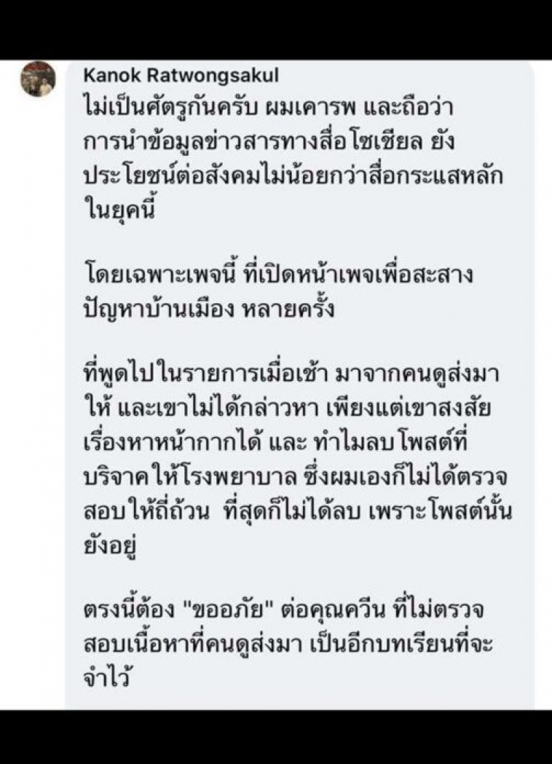 ที่พูดในรายการเมื่อเช้า มาจากคนดูส่งมาให้ และเขาไม่ได้กล่าวหา เพียงแต่สงสัยเรื่องหาหน้ากากได้ และทำไมลบโพสต์ที่บริจาคให้โรงพยาบาล ซึ่งผมก็ไม่ได้ตรวจสอบให้ถี่ถ้วน ที่สุดก็ไม่ได้ลบ เพราะโพสต์นั้นยังอยู่