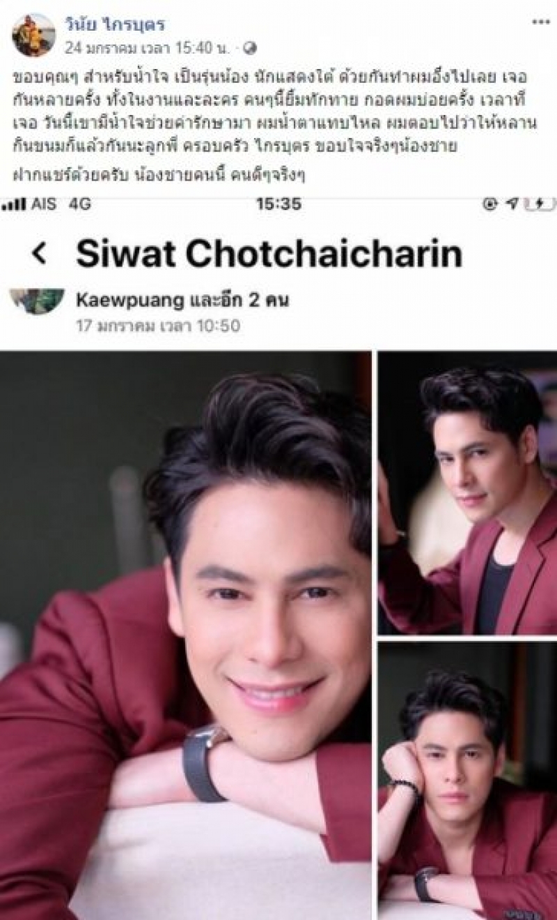 ล่าสุดทำเอาแฟนๆ แห่คอมเม้นท์สนั่น หลัง เมฆ วินัย ไกรบุตร ได้ออกมาโพสต์ถึงรุ่นน้องอย่างหนุ่มซี ศิวัฒน์โดยได้ระบุข้อความว่า ขอบคุณๆ สำหรับน้ำใจเป็นรุ่นน้องนักแสดงใต้ด้วยกันทำผมอึ้งไปเลยเจอกันหลายครั้งทั้งในงานและละคร คนๆนี้ยิ้มทักทายกอดผมบ่อยครั้งเวลาที่เจอ วันนี้เขามีน้ำใจช่วย ดูแลจ่ายให้ทั้งหมดผม ตอบไปว่าให้หลานกินขนมก็แล้วกันนะพี่ครอบครัวผมขอบใจจริงๆ