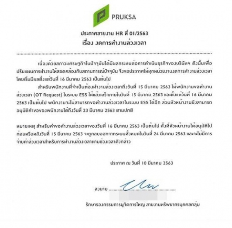 เนื่องด้วยสภาวะเศรษฐกิจในปัจจุบันได้มีผลกระทบต่อการดำเนินธุรกิจของบริษัทฯ ดังนั้น เพื่อปรับแผนการทำงานให้สอดคล้องกับสถานการณ์ปัจจุบัน จึงขอประกาศให้ทุกหน่วยงานงดการทำงานล่วงเวลา โดยเริ่มมีผลตั้งแต่วันที่ 16 มีนาคม 2563 เป็นต้นไป