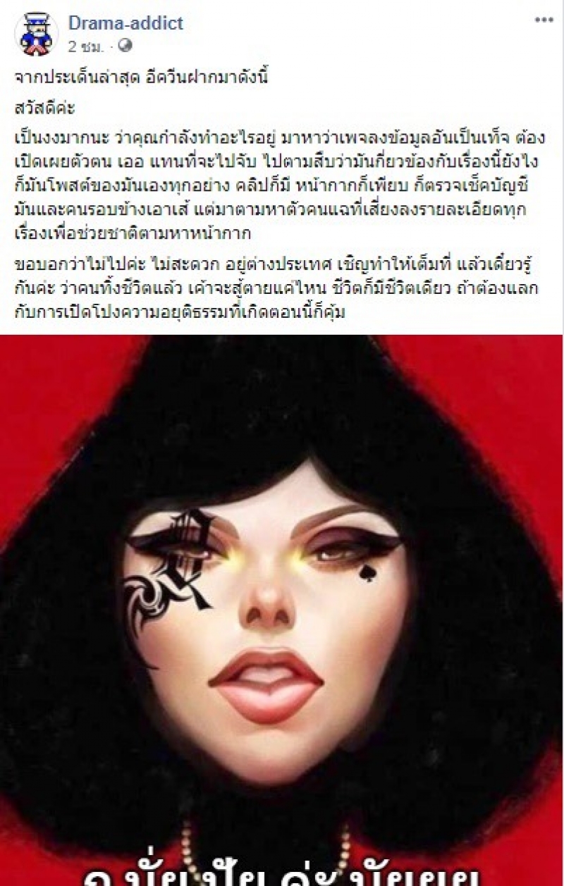 ล่าสุด แฟนเพจเฟซบุ๊ก Drama-addict ได้โพสต์ข้อความระบุว่า จากประเด็นล่าสุด ควีนฝากมาดังนี้ สวัสดีค่ะ เป็นงงมากนะ ว่าคุณกำลังทำอะไรอยู่ มาหาว่าเพจลงข้อมูลอันเป็นเท็จ ต้องเปิดเผยตัวตน เออ แทนที่จะไปจับ ไปตามสืบว่ามันกี่ยวข้องกับเรื่องนี้ยังไง ก็มันโพสต์ของมันเองทุกอย่าง คลิปก็มี หน้ากากก็เพียบ ก็ตรวจเช็กบัญชีมัน และคนรอบข้างเอาสิ แต่มาตามหาตัวคนแฉที่เสี่ยงลงรายละเอียดทุกเรื่องเพื่อช่วยชาติตามหาหน้ากาก